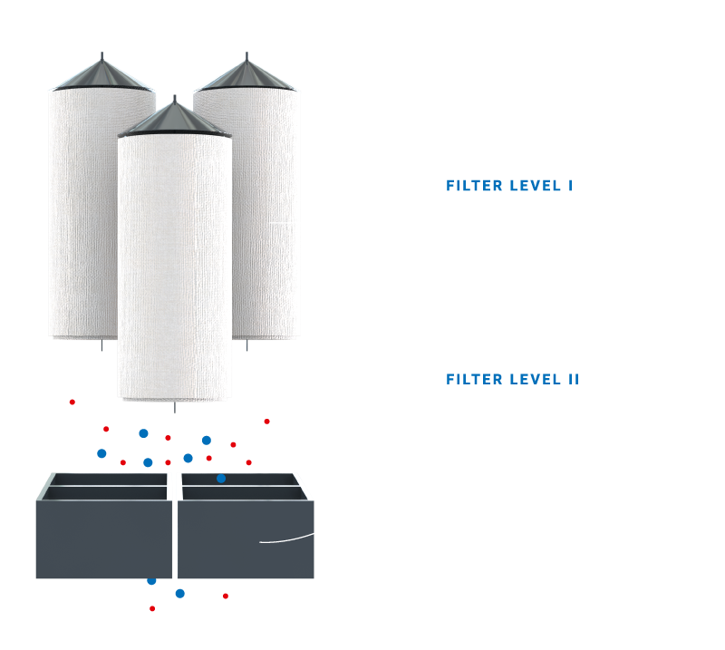 The air is cleaned through multiple filter stages and returned to the work area without drafts. The lower fresh air layer ensures optimal working conditions at the workplace and is regularly circulated.